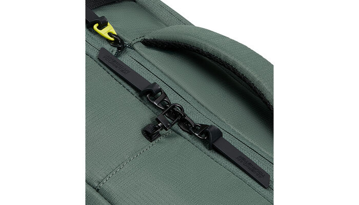 - 100 % (nach Gewicht) des Innenfutters, der Dehnfalte und der Reißverschlüsse bestehen aus recyceltem PET-Kunststoff, der aus 27 recycelten 500-ml-Flaschen hergestellt wurde.