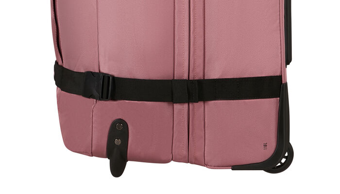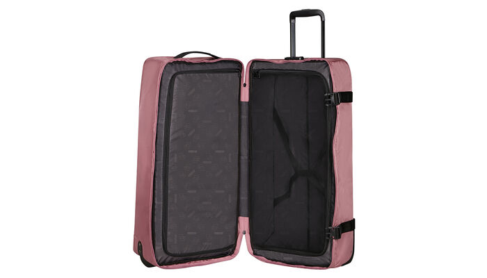 Le sac est équipé de roulettes intégrées pour faciliter les déplacements et le transport.
