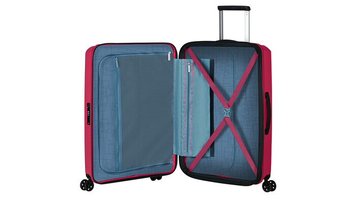 Elastische Kreuzbänder in Boden- und Deckelfach, ergänzt durch eine Trennwand und verschiedene Taschen für Packkomfort und Organisation