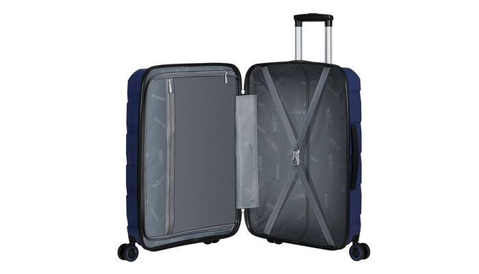 Elastische Kreuzbänder im Bodenfach und eine Trennwand mit Reißverschluss-Netztasche zur einfachen Aufbewahrung und Trennung deines Gepäcks