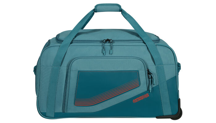 Le sac est équipé de roulettes intégrées pour faciliter les déplacements et le transport.
