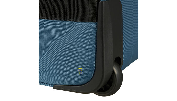 Le sac est équipé de roulettes intégrées pour faciliter les déplacements et le transport.